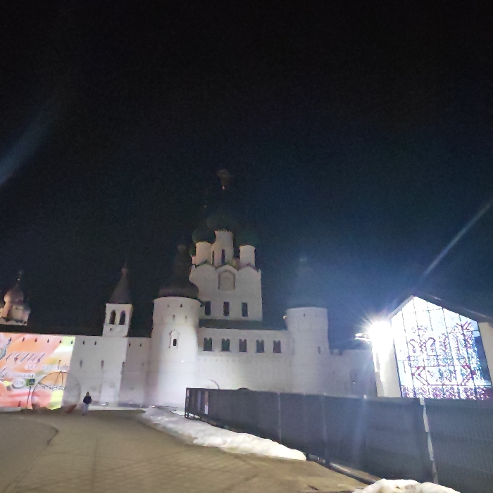 This image captures a nighttime exterior view of a large architectural complex in Ketoshi, Russia. The central feature is a prominent white-walled fortress-like structure, consisting of multiple towers and a main cathedral or church building. The church structure is white, multi-tiered, and topped with several dark, likely green, onion-shaped domes. To the far left, another smaller domed building is partially visible. The walls of the complex are brightly illuminated by artificial lights, creating lens flares in the upper left and right portions of the frame. In the foreground, a paved pathway extends from the bottom of the image towards the complex. Patches of snow are visible on the ground, particularly along the right side of the pathway. A dark, low barrier or fence runs parallel to the pathway, separating it from the main complex on the right. One solitary individual is observed walking on the paved pathway towards the left, appearing small against the scale of the fortified walls. To the immediate left of the central gate-like arch in the wall, a large, rectangular banner displaying colorful graphics and Cyrillic text (partially legible) is affixed to the wall. To the right of the main white complex, a distinct, modern-looking building with a large, brightly illuminated, multi-colored window, possibly stained glass or a mosaic, is visible. The sky above is dark and clear.