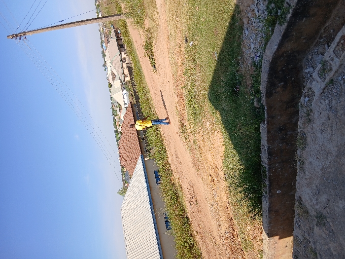 The image depicts an outdoor, sunny daytime scene in a residential area within the city of Unknown, Unknown. A reddish-brown dirt road, sloping upwards from left to right, dominates the midground. A single individual stands on this road, facing away from the camera and looking towards the right. This person is wearing a yellow short-sleeved shirt, blue jeans, and red footwear; their shadow is visible on the road ahead of them. To the left of the road, two houses are visible. The closest house features a light-colored corrugated roof, light-toned walls, and multiple rectangular blue windows. The adjacent house has a reddish-brown tiled roof. Along the right side of the road, a tall, concrete utility pole stands, from which multiple utility lines extend diagonally across the clear blue sky. The background reveals a sprawling residential neighborhood with numerous houses, exhibiting various roof types and colors, spread across an uneven or hilly landscape under a clear blue sky with minimal cloud cover. Sparse green and dry vegetation lines the dirt road and parts of the terrain. In the immediate foreground, a weathered concrete drainage ditch or wall runs horizontally, topped by dry soil and green vegetation, with a dark, triangular shadow cast upon it. The scene is brightly lit by natural sunlight, creating distinct shadows.
