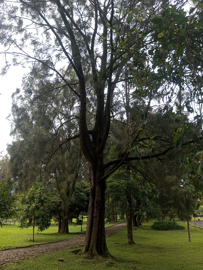 A serene park scene features a stone path winding through lush green grass. A large tree with a thick, textured trunk stands prominently in the foreground, its branches reaching upwards and interspersed with the foliage of other trees. The sky is overcast, creating a soft, diffused light. Diverse trees and plants add depth and visual interest to the landscape.