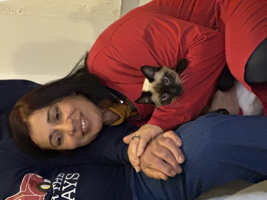 A woman in a red top lies on a person wearing a blue shirt. The woman is smiling with her dark hair spread out. A Siamese cat peeks out from the woman's top, nestled near her shoulder. The person in the blue shirt has their hands clasped.