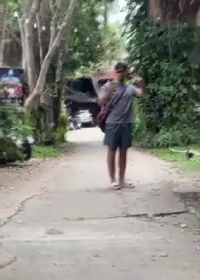 man walking on a paved path. The man has a mustache and is wearing a gray t-shirt, patterned shorts, and sandals. He is carrying a bag over his shoulder and holding a cell phone in his hand. The path is surrounded by green trees and foliage. There is a thatched-roof structure to the right and a building and parking area in the background. The man pauses and turns slightly to face the camera.