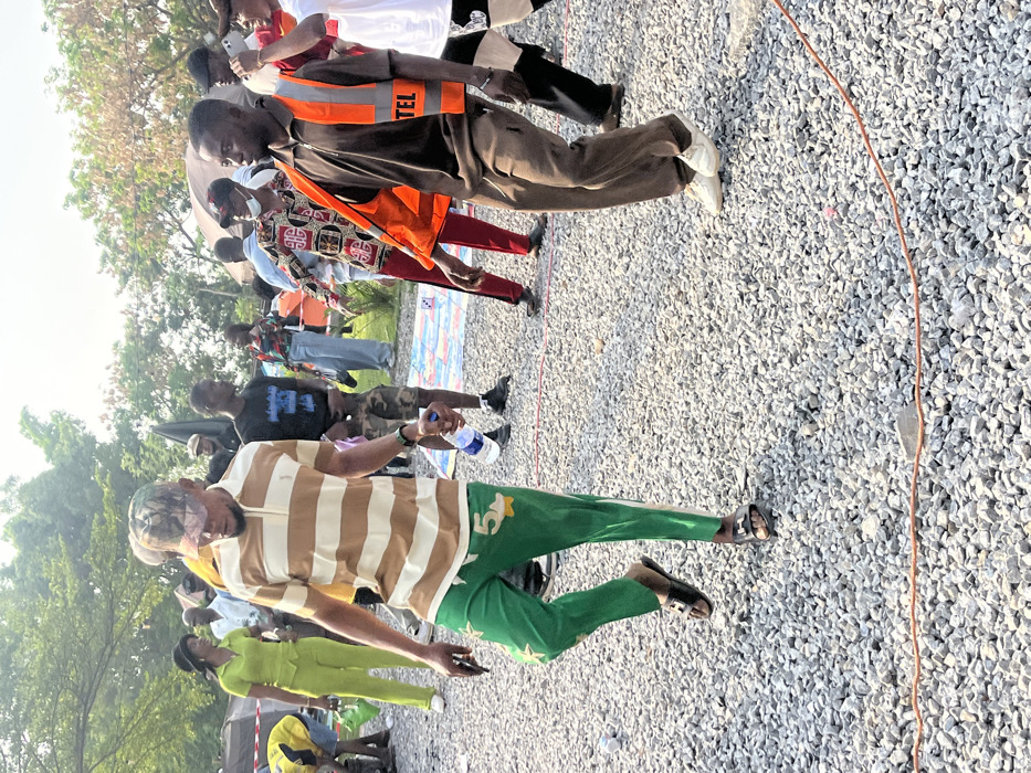 An outdoor scene in Karmajiji, Nigeria, depicts a gathering of individuals on a light-colored gravel surface under daylight conditions. In the immediate foreground, two males are prominent. The first, on the left, is light-skinned, wears a camouflage baseball cap, a brown and white striped polo shirt, green trousers with yellow '5' and star decals, and black slide sandals. He holds a clear plastic water bottle in his right hand and a dark smartphone in his left, with his left leg lifted in motion. The second male, on the right, is dark-skinned, dressed in a dark brown short-sleeved shirt, brown trousers, and white sneakers, overlaid with an orange reflective vest displaying "TEL" on the left chest. He is also in motion, facing forward but looking slightly left. An orange-red cable traverses the gravel ground in the lower frame. In the midground and background, numerous other people are visible. These include a woman in a lime green two-piece outfit and a dark bucket hat, a person in a yellow top bent over, and various others in casual attire, such as t-shirts, patterned shirts, and shorts. A blue and white patterned mat or tarp is visible on the ground in the midground. The distant background features trees and foliage, with some dark fabric structures or tents partially visible on the far left. The sky appears bright.