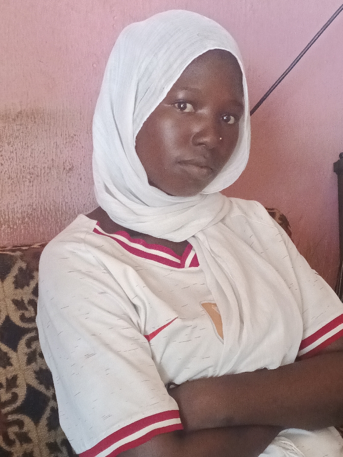 A person with dark skin, wearing a white headscarf and a white short-sleeved top with red and white striped collar and cuffs, is seated indoors in Doma, Nigeria
