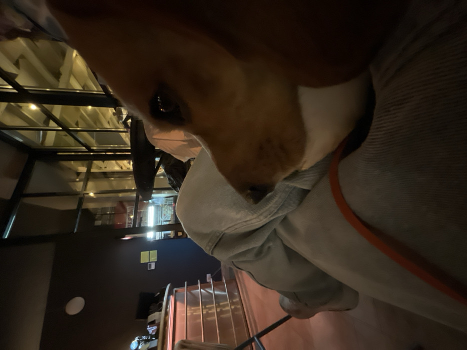 This image depicts an interior scene, located in Rafailovići, Montenegro, observed from a low perspective. A brown-furred dog, with its head resting on a seated individual's lap, occupies the foreground. The individual is partially visible, wearing light-colored denim jeans and light-colored shoes. An orange leash extends across their thighs. To the left, a dimly lit bar area features a curved counter constructed with reddish-brown horizontal panels. Beverage taps are visible above the counter. A white circular light fixture is mounted on a dark wall further left, with two yellow sticky notes affixed to the wall below it. The background's right and central sections are dominated by large glass windows or partitions, reflecting interior lights and revealing architectural elements beyond, along with a partial red sign displaying "PEPERONI". A dark, cylindrical bar stool leg is visible near the seated individual's left foot. The overall lighting is subdued, suggesting evening or indoor ambient conditions.