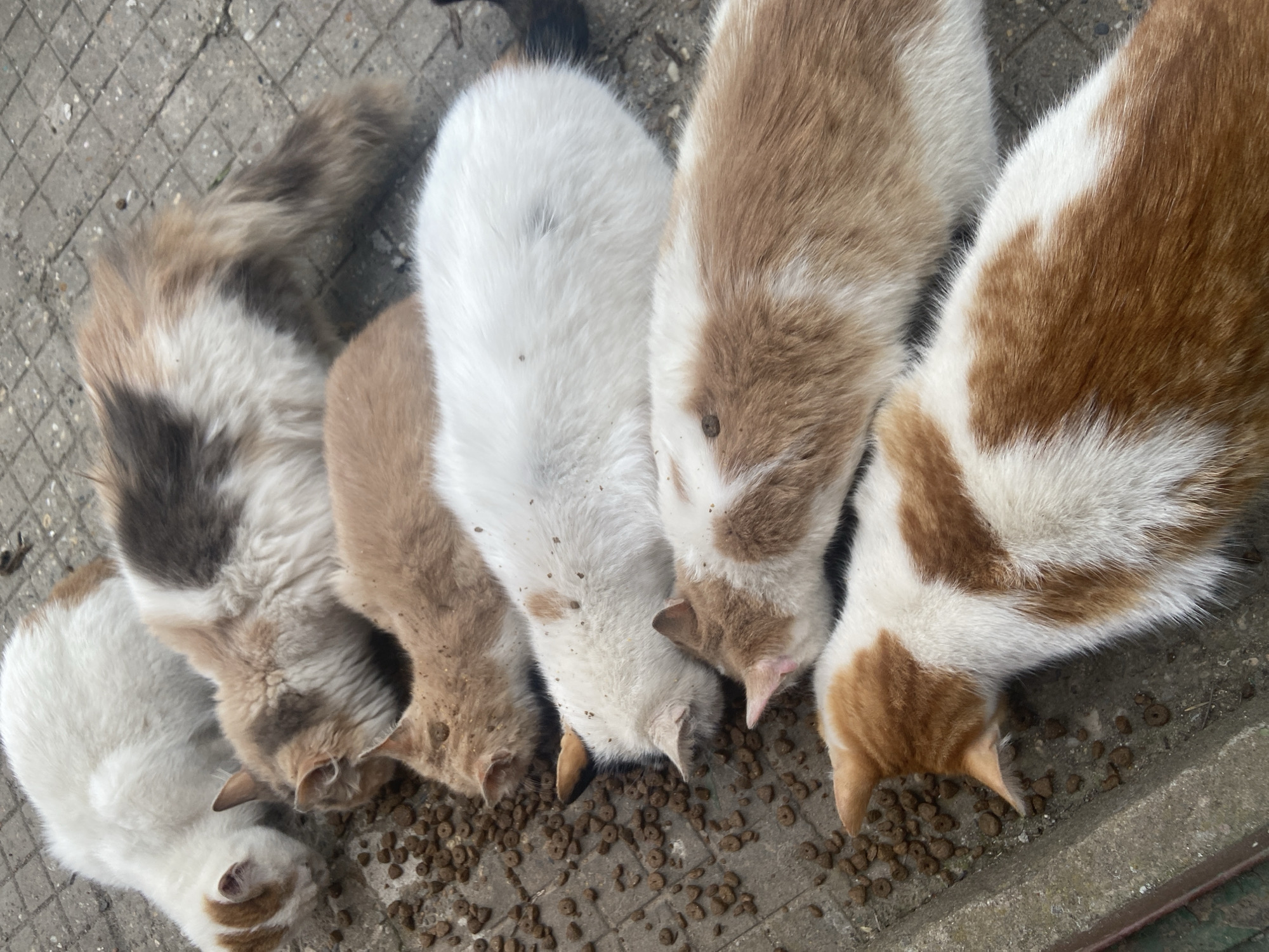 Five cats are eating dry food scattered on a concrete surface in Gulyantsi, Bulgaria. The cats are arranged in a row, heads down, consuming the food. From left to right, the cats are calico, tan, white, tan and white, and orange and white. Their tails and rumps are visible. The concrete surface shows signs of wear and staining.