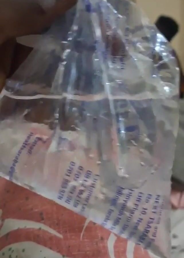 hand holding a clear plastic bag filled with water. The bag has printed information on it. The background shows a red and white patterned fabric and a person sitting in a chair with their back to the camera. The water in the bag sloshes around as the hand moves.