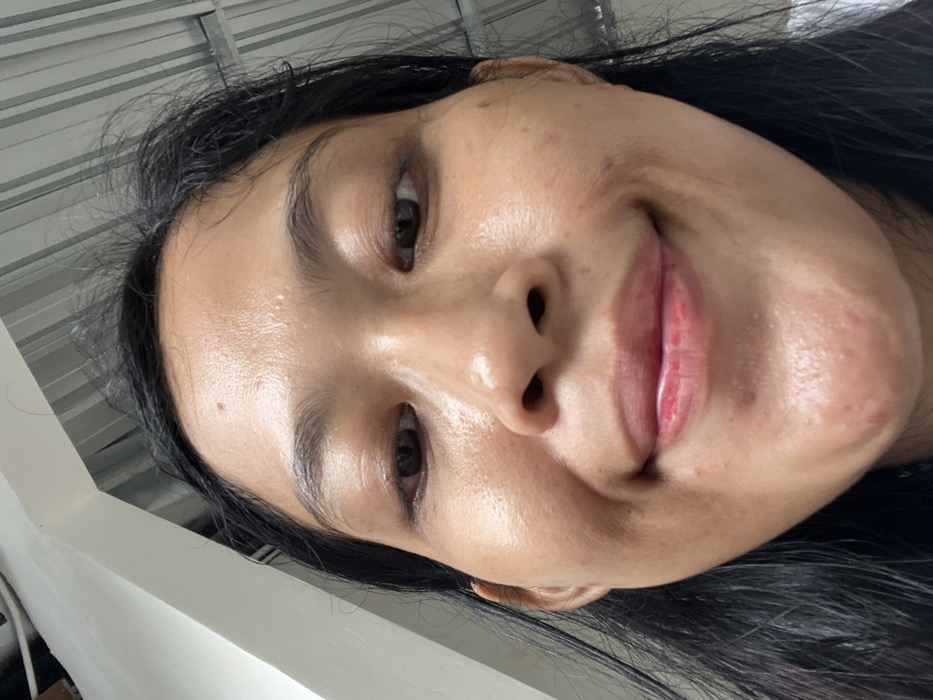 A close-up, low-angle shot features a woman with dark hair and a warm complexion. Her eyes are dark and slightly closed, with a gentle smile evident in her lips and cheeks. The skin has a subtle sheen, and minor blemishes are visible on her face. The background reveals a ceiling with white beams or panels. The angle gives a personal, almost intimate perspective.