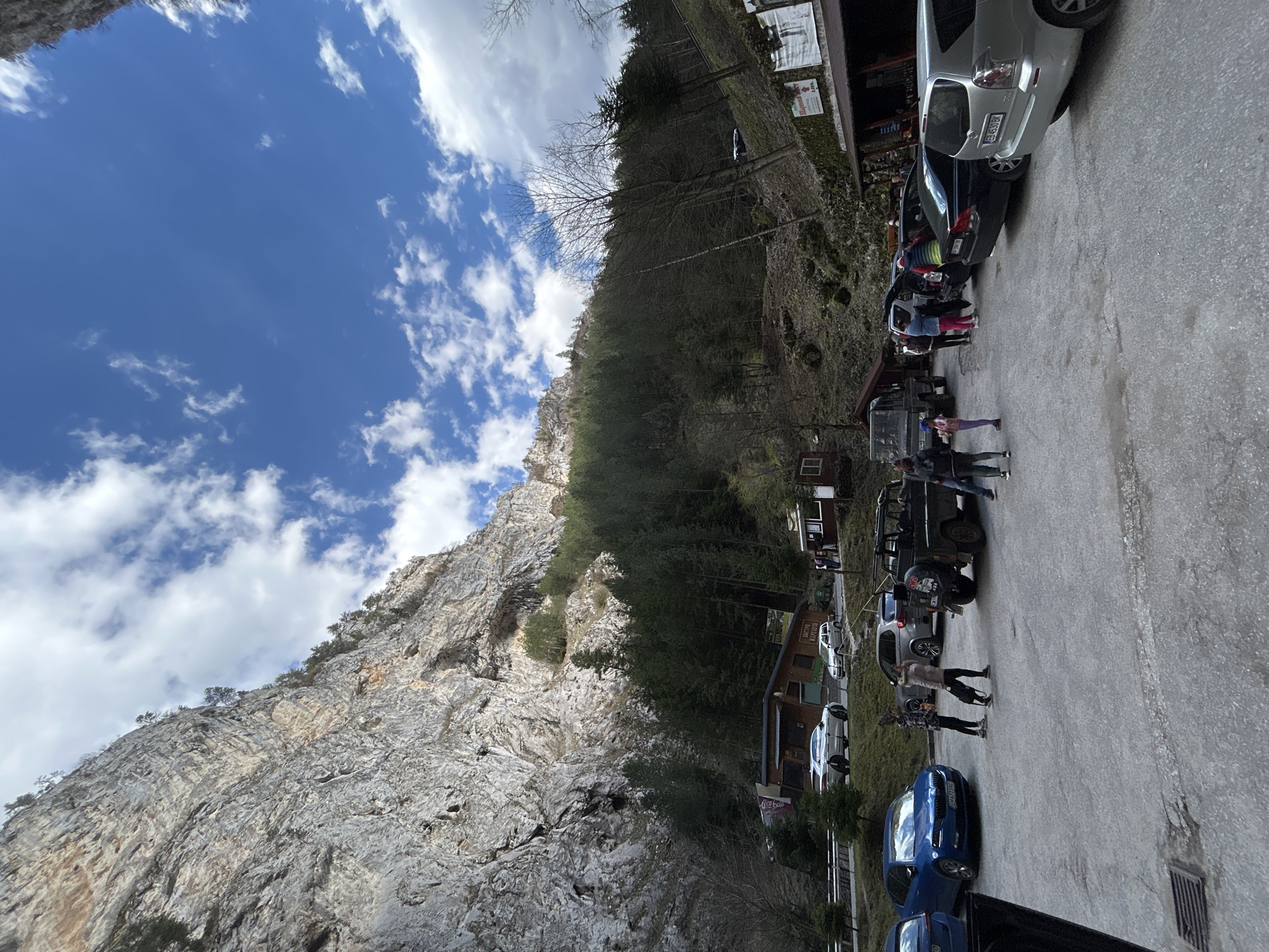 mountainous landscape with a parking lot in Iagodina, Bulgaria. A large rock formation dominates the left side of the frame, with vegetation growing on its slopes. Adjacent to the rock is a wooded area. A building, possibly a restaurant, is partially visible along the roadside on the right. Several cars are parked in the parking lot. A small group of people are present near the parked vehicles. The sky is blue with scattered clouds.