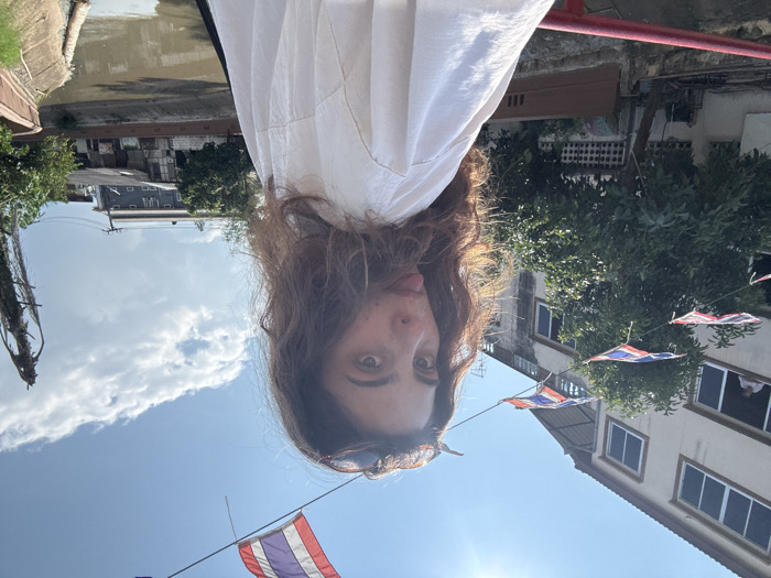 The image captures a female subject, estimated to be in her 20s to 30s, positioned in the foreground, appearing to look over her right shoulder directly at the camera. She has long, wavy brown hair, with sunglasses perched on her head, and is wearing a light-colored, loose-fitting long-sleeved shirt. Her facial expression shows her mouth slightly open with her tongue extended. She is positioned above a red metal railing, indicative of a bridge or walkway. The midground features a murky brown canal running horizontally, with concrete-lined banks and sparse vegetation. The background displays urban architecture typical of Chiang Mai City Municipality, Thailand. On the left, a multi-story, light-colored building with multiple windows is visible; a male figure in a white shirt is partially visible looking out from a top-floor window. A green, leafy tree stands between this building and the canal. Several small Thai flags, characterized by horizontal red, white, and blue stripes, are strung on a line across the upper-left portion of the frame. To the right, older, darker-toned buildings are partially obscured by trees and a tall utility pole heavily wrapped in vines. The scene is under bright daylight from a high sun, creating a lens flare in the upper left, beneath a blue sky with scattered white clouds.