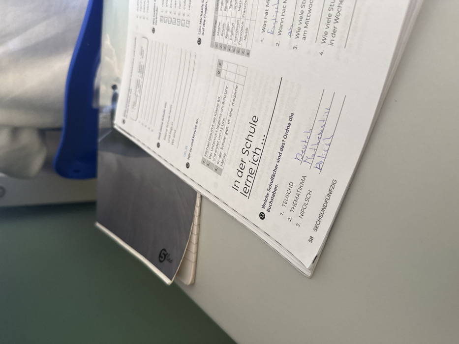 The scene depicts an interior environment, specifically a classroom or study area, located in Kardzhali, Bulgaria. A light-colored desk surface occupies the foreground, upon which rests a white paper workbook or test. The workbook is open to page 56 and features German language exercises. Prominently displayed is a section titled "In der Schule lerne ich...", beneath which exercise 13 requires ordering jumbled letters to form school subjects. Handwritten responses in blue ink include "Deutsch" (German), "Mathematik" (Mathematics), and "Polisch" (likely intended as Polish). Text in Cyrillic script is visible on the right page of the workbook. Behind the workbook, a dark gray spiral-bound notebook, bearing a stylized "S" logo, is partially visible. The background is blurred, showing a portion of a person in a white garment, a blue chair backrest, and a green wall. The overall impression is of an academic setting during an active learning or testing period.