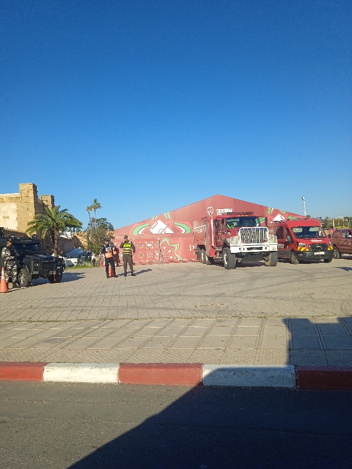 The image displays an outdoor scene in a public plaza in Salé, Morocco, under a clear, bright blue sky. A large, red, triangular tent structure, adorned with intricate white, green, and red patterns, occupies the central background. An emblem is visible on the tent's upper section. Parked directly in front of the tent are two emergency vehicles: a red and white fire engine with its front grille facing the viewer, and to its right, a red emergency rescue van or ambulance, also facing forward, featuring "POMPIERS" text on its side and a Moroccan license plate "34747 C". A third, darker red vehicle is partially visible to the far right of the ambulance. On the left side of the paved plaza, adjacent to ancient light-brown stone structures resembling a historical wall or fort, a dark-colored, rugged SUV (possibly a Land Rover Defender) is parked. Two orange traffic cones are positioned near its front. Several palm trees are scattered behind the vehicles and near the historical structures. Four individuals are present. One person in a dark uniform stands near the front left of the dark SUV. Two other individuals, appearing to be in official attire (one in an orange vest, the other in a dark uniform with a yellow reflective vest), stand near the center of the paved area. A fourth person is partially visible near the rear of the dark SUV. The foreground consists of a clean, light-colored paved plaza with a grid-like pattern of square tiles. Immediately in front, a dark asphalt road is visible, separated by a red and white painted curb. Strong shadows are cast across the road and curb, indicating direct sunlight from a high angle. The scene suggests a public event or standby emergency presence in a historical urban setting.