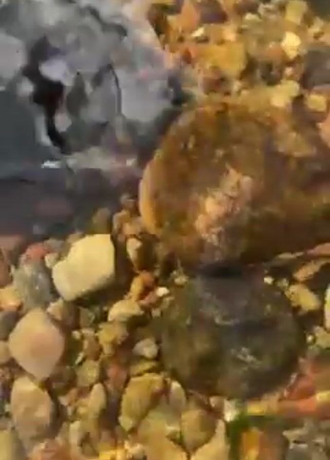 stream with rocks of varying sizes visible through the clear water. The camera is positioned above the water, looking down. A gray, shapeless object, possibly a piece of clothing or fabric, is partially submerged in the water, moving slightly with the current. The stream bed is composed of numerous small, colorful pebbles and a few larger rocks. The overall lighting suggests a bright, sunny day, creating clear visibility underwater. There is no audible sound.