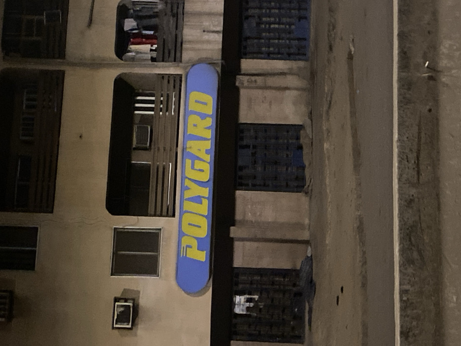 A rotated, low-lit exterior shows a building. A blue sign with yellow "POLYGARD" text hangs vertically on the right. The building's architecture includes multiple windows and balconies with metal bars. Some windows have air conditioning units. The building's wall appears aged. A concrete structure stands alongside the building.