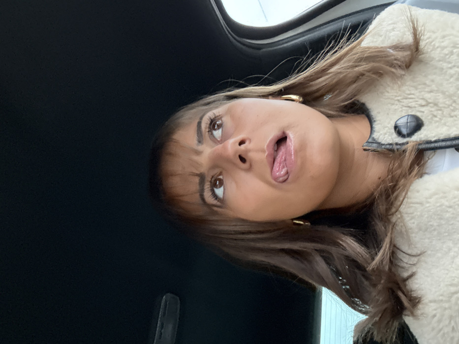 The image depicts a female individual with medium-brown hair and bangs, situated inside a vehicle in Veauche, France. Her head is angled slightly upwards and to the right, with her brown eyes directed towards the upper right. Her mouth is open, revealing her tongue extended and curled upwards, positioned towards her upper lip. She wears gold-colored hoop earrings and a cream-colored, textured vest or jacket with a black trim and a visible dark, round button. A white garment is visible underneath the vest. The vehicle's dark headliner occupies the upper background, and a window or light-colored exterior is visible on the right side of the frame.