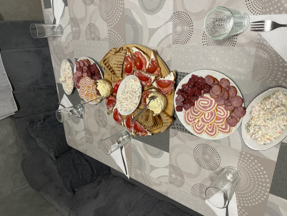 The image depicts an indoor scene in Tarnava, Bulgaria, showing a dining table set with food and dinnerware