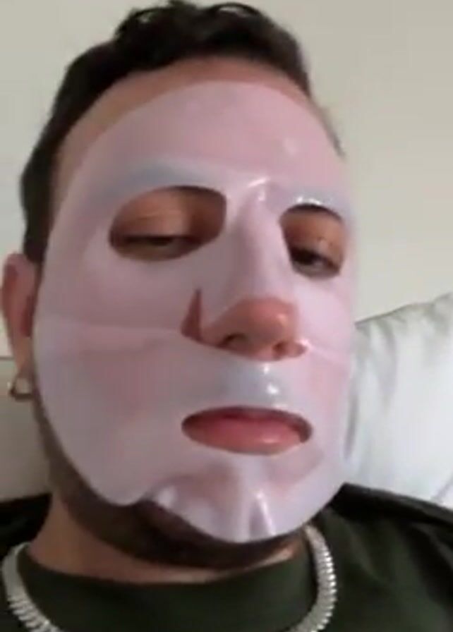 man with a pink sheet mask on his face. He is lying on a bed with a white pillow behind him. He is wearing a dark green shirt and a silver chain. He holds up a finger covered with the mask's serum. He then smooths the mask on his face with his fingers. The background is a plain white wall. There is music playing.