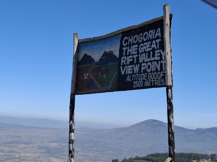A wooden sign stands against a clear blue sky. The sign reads, "CHOGORIA THE GREAT RIFT VALLEY VIEW POINT ALTITUDE 8000FT 2500 METRES." The sign is painted black with white lettering. The sign is supported by two wooden poles that are painted white and black. The sign is located in the Escarpment, Kenya at coordinates -1.021, 36.622. The sign stands on a hilltop overlooking a vast, flat landscape. The landscape is a mixture of green and brown, with trees scattered throughout. In the distance, a range of mountains is visible.