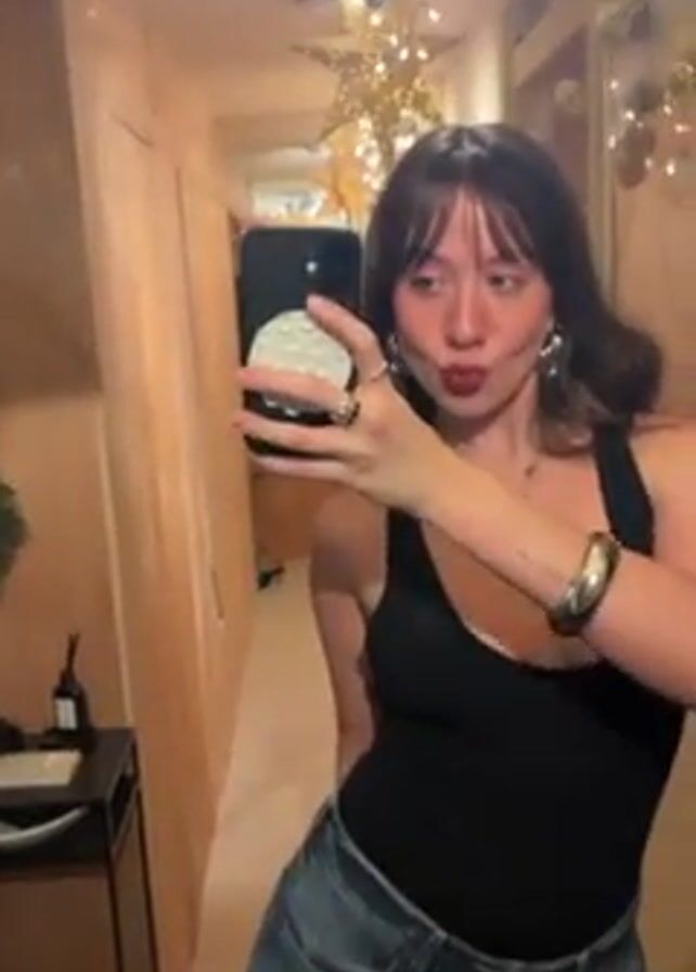 A young woman takes a selfie in a mirror. She has brown hair with bangs and is wearing a black tank top and blue jeans. She is also wearing jewelry, including earrings, rings, a necklace, and a bracelet. The background shows a hallway with wooden doors and a star-shaped light fixture. A small table with a diffuser is visible in the corner. She makes a kissy face at the camera.