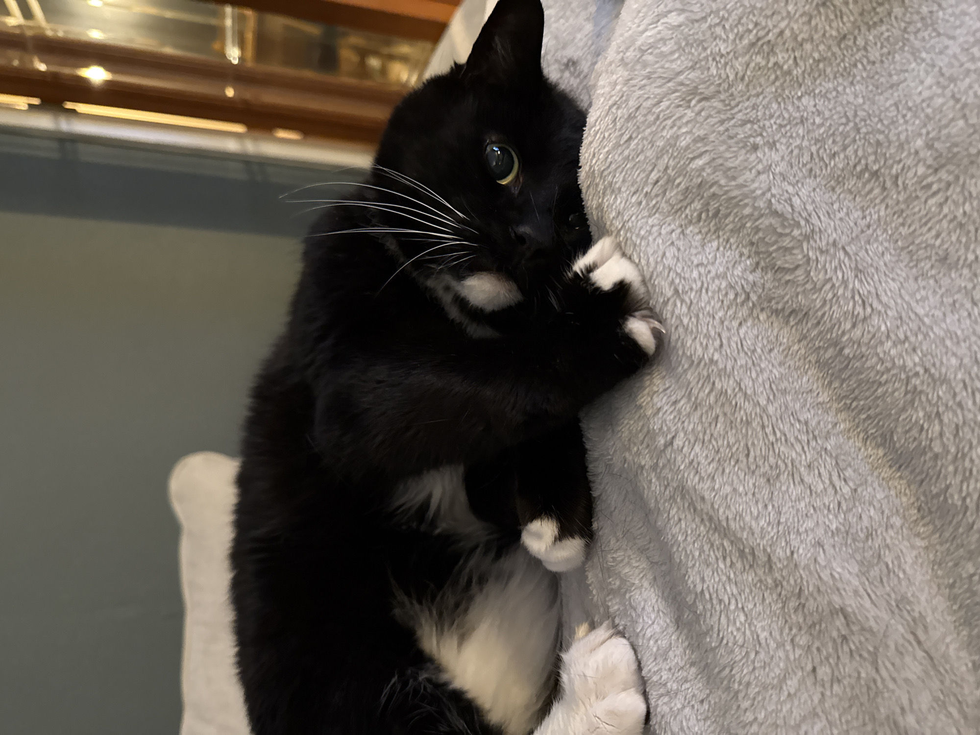 A black and white tuxedo cat is lying on a grey, textured blanket. The cat's head is near the top of the frame, with its eye open and whiskers visible. The cat is holding its paw near its face. The background is slightly out of focus, showing a piece of furniture with a reflective surface. The image was taken indoors. Location information is not discernable from the image.