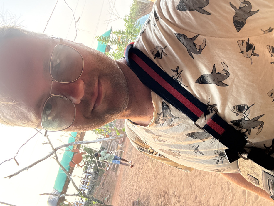 An outdoor, eye-level selfie captures a light-skinned male in the foreground, slightly smiling, wearing round metal-rimmed eyeglasses that reflect the bright sky. He wears a light-colored t-shirt patterned with grey sharks and a cross-body bag with a dark blue and red striped strap. The background features a reddish-brown dirt path under a bright, hazy sky in Bhagatwadi, India. In the middle ground, a second male, with darker skin, wearing a light t-shirt and blue shorts, walks from left to right on the path. Two dogs, one light brown and one darker, are visible near his feet. To the upper left, a multi-level outdoor establishment with a green tarp roof and wooden railings is visible, featuring a large orange crab-shaped sign and partially visible text "BHAI CRAB". Bare tree branches and wires extend across the frame.
