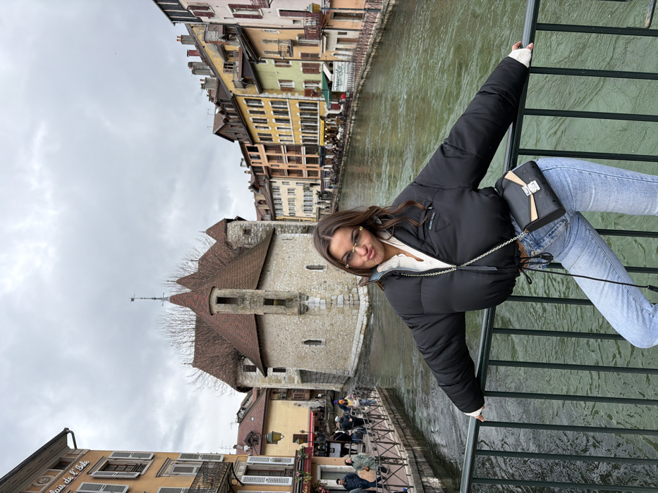 A young adult female poses centrally on a dark metal bridge railing in Annecy, France, with the iconic Palais de l'Isle in the background