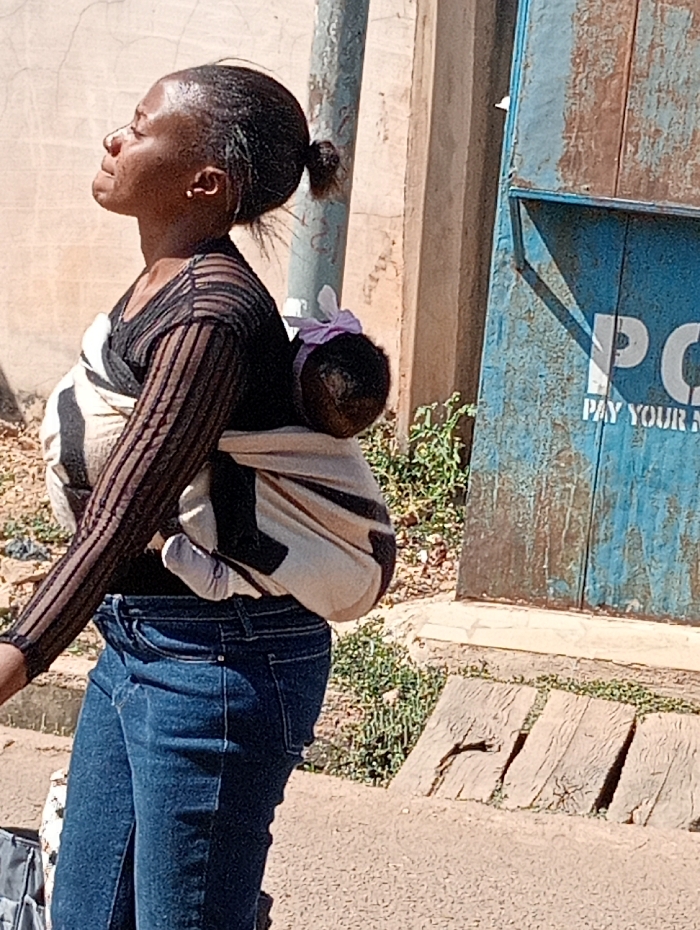 An outdoor scene in Jos, Nigeria, depicts a dark-skinned adult female walking left to right in profile under strong sunlight. Her hair is pulled back into a small bun. She wears a black long-sleeved sheer-striped top and dark blue denim jeans. An infant, visible from the back of its head with a purple bow, is strapped to her back in a patterned fabric carrier. To the right in the background stands a weathered blue wooden structure, possibly a utility payment kiosk, bearing faded white text partially legible as "PC" and "PAY YOUR N," indicating a transaction involving Nigerian Naira. Behind the woman, a light-colored concrete wall is visible. The ground is unpaved, displaying small green foliage and several rectangular wooden planks in the right foreground.