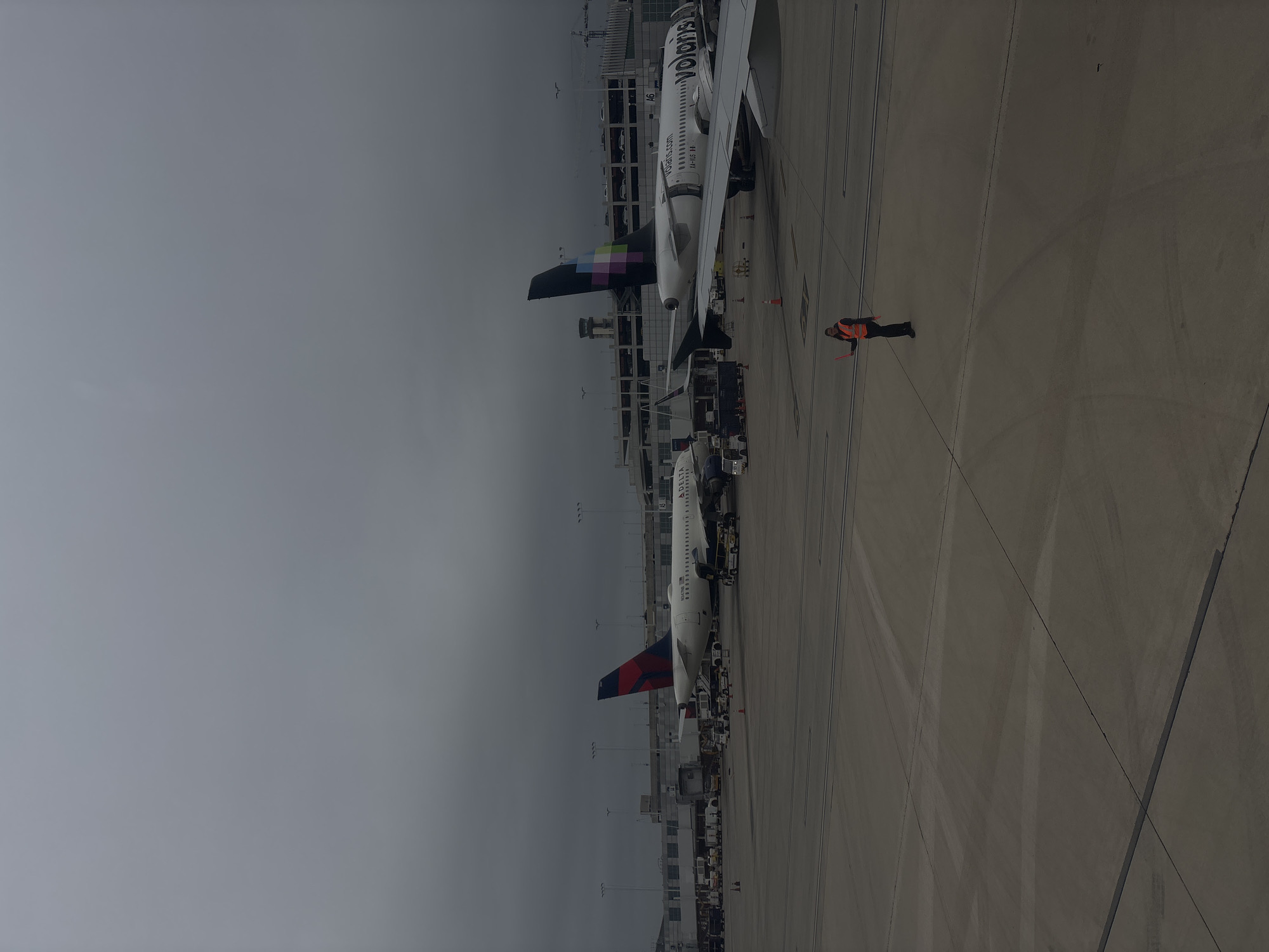 The image displays an airport apron scene at San Antonio International Airport (SAT), San Antonio, United States, under an overcast, grey sky. Two commercial passenger aircraft are visible. On the left, a Delta Airlines Airbus A320 family aircraft, bearing registration N547NB, is parked at a gate, connected to a jet bridge. It features a white fuselage with a blue and red tail fin. Various yellow and white ground support equipment, including baggage loaders and service vehicles, are positioned around this aircraft. On the right, partially obscured by its wing, a Volaris Airbus A320 family aircraft, registered XA-YUS, is also parked at a gate. This aircraft has a white fuselage with the "Volaris.com" logo and a distinctive black tail fin adorned with a multicolored geometric pattern (magenta, teal, green, purple, yellow squares). In the lower center-right of the frame, a single individual, identified as airport ground crew, stands on the concrete apron. This person is wearing an orange high-visibility vest over dark clothing and holds two red marshaling wands, one in each hand, in a signaling posture. The background features terminal buildings with multiple jet bridges, numerous tall metal light poles, a multi-story parking garage densely packed with cars, and a distant air traffic control tower. The concrete apron exhibits expansion joints and faint ground markings.