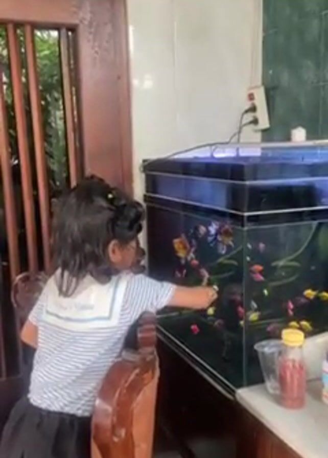 A little girl with dark curly hair is feeding fish in an aquarium. She is wearing a white and blue striped shirt with a dark skirt and is sitting on a wooden chair. The aquarium is large and rectangular, filled with colorful fish and some aquatic plants. There are bottles of fish food and supplies on a marble countertop next to the aquarium. A wooden door is visible to the left, leading to an outdoor area with greenery. The background includes white tiled walls and a green tiled section near an electrical outlet. The girl reaches into the aquarium to feed the fish, her arm partially submerged in the water.