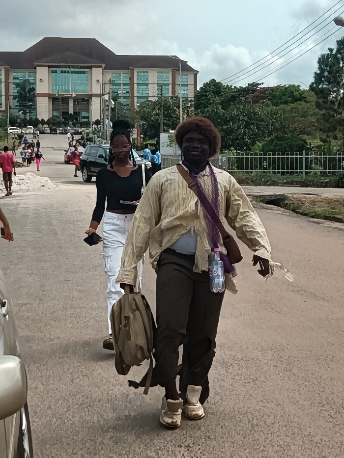 The image displays an outdoor street scene in Owerri, Nigeria, with the Imo State Secretariat building prominently in the background. In the foreground, two individuals walk on a paved road. On the right, a dark-skinned adult male, wearing a brown afro-style wig, smiles towards the camera. He wears a light-colored, striped, long-sleeved shirt over a light blue undershirt, dark trousers with visible tears at the knees, and worn light-colored sneakers. He carries a khaki-colored backpack in his left hand and tattered white material in his right hand. A purple net-like fabric is draped over his left shoulder, suspending a plastic water bottle and a small dark pouch. To the male's left and slightly behind him, a dark-skinned adult female walks with eyeglasses and her hair in an updo. She wears a black long-sleeved crop top and white cargo trousers, holding a black smartphone in her left hand and a light-colored object in her right. Her gaze is directed towards the left foreground. The road surface is asphalt. On the far left, a portion of a silver vehicle is visible. In the midground, a black SUV is present on the road, along with a pile of light-colored construction material. Multiple other pedestrians are visible in the background, walking on an uphill road leading to the Imo State Secretariat building. This large, multi-story structure features a brown roof and a facade with numerous blue-tinted glass windows. Dense green vegetation, utility poles with overhead wires, and a white metal fence line the right side of the road. The sky is overcast.