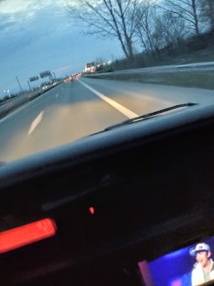 The image presents a forward view from the interior of a vehicle traveling on a multi-lane highway in Radinovo, Bulgaria. The scene appears to be set at dusk or dawn under an overcast, blue-grey sky. The vehicle's dark dashboard and a portion of the windshield wiper are visible in the lower foreground. An illuminated red indicator light is present on the left side of the dashboard. On the lower right, an electronic screen displays a male individual wearing a light-colored hat, positioned against a blue background, consistent with a video or television program. The highway features a prominent solid white lane marking on its right side, with headlights and taillights from other vehicles discernible in the distance, indicating ongoing traffic. Overhead road signs are visible further along the road. Bare deciduous trees line the right shoulder of the highway. The image exhibits minor motion blur, suggesting the vehicle is in motion.