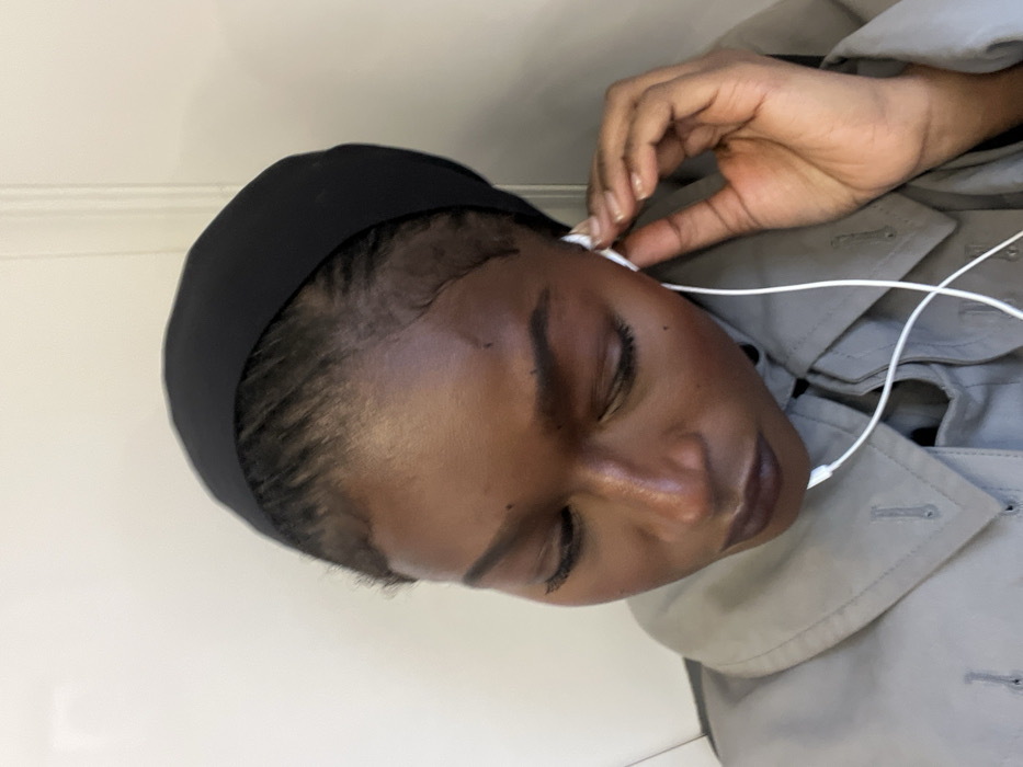 An individual with a dark skin tone is depicted in a close-up, angled shot. They are wearing a black headband covering their hair, which is pulled back. Their eyes are downcast. They wear a light grey or khaki-colored trench coat with a visible collar and button details. White wired earbuds are inserted into both ears, with the wires crossing in front of their chest. The individual's right hand is raised, with fingers touching or adjusting the right earbud. The background is a plain, light-colored wall or partition. The scene is located in Champs-sur-Marne, France.
