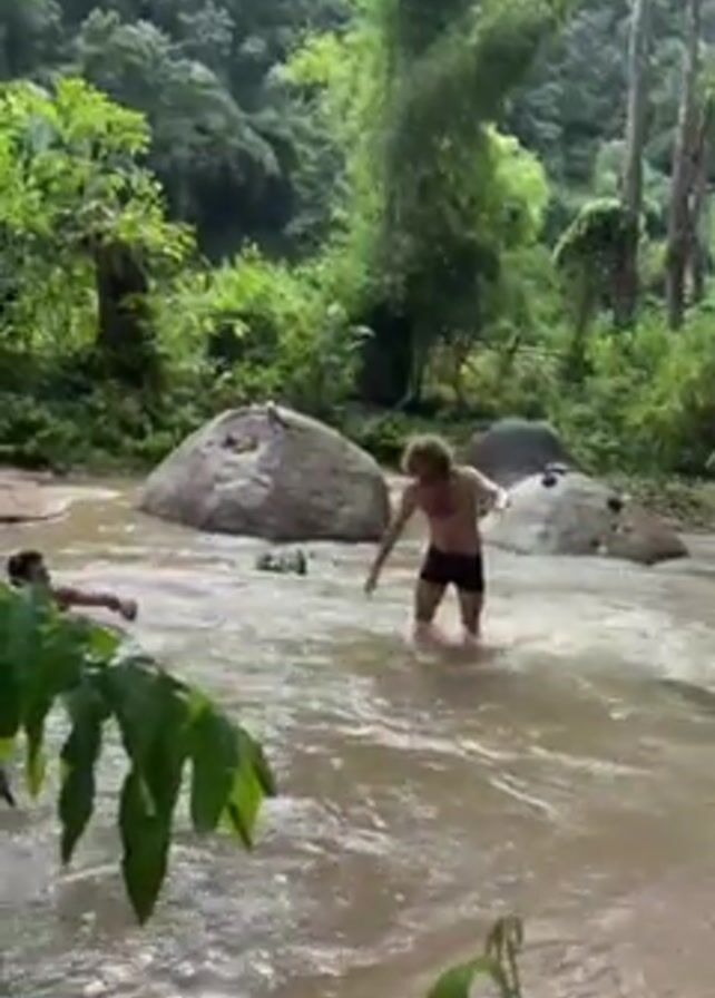 Two men are in a stream surrounded by lush greenery. The stream is shallow and rocky, with large boulders visible above the water line. The man on the right is standing in the water, wearing dark shorts and shirtless. The man on the left is also shirtless and appears to be lying in the water. The surrounding environment consists of dense green foliage, including trees, plants, and bamboo. The video is shot from a low angle, with a plant in the foreground partially obscuring the view. The water is slightly murky, with a brownish tint. The overall scene evokes a sense of nature and relaxation.