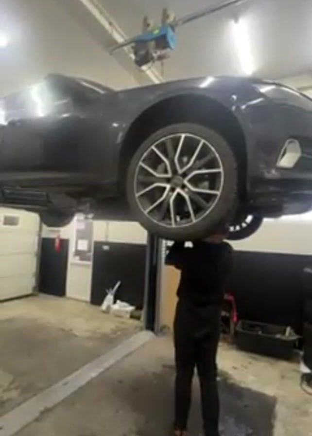 A person in black clothes works on a gray car lifted up on a lift