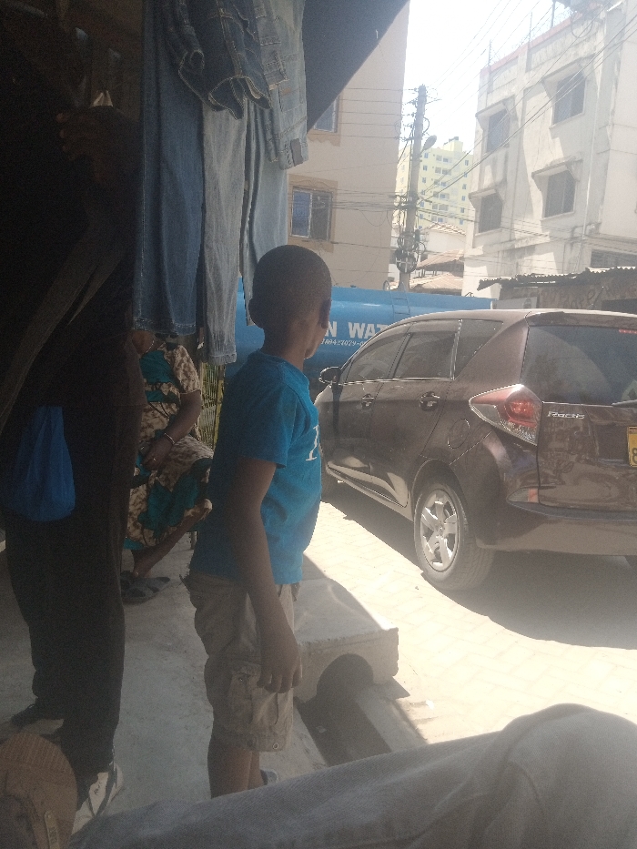 The image captures an urban street scene in Tudor ward, Kenya, under bright daylight. In the shaded foreground, several pairs of blue denim trousers hang from an overhead line or rack. To the far left, a person clad in dark attire stands, partially obscured, with a blue object visible by their leg. Behind this figure, another individual in a patterned brown, blue, and white dress is seated or crouching. A light-colored, possibly concrete, block with an arched opening rests on the paved ground. Centrally, a young boy, appearing to be African, stands facing away from the camera, looking towards the right. He wears a blue t-shirt and light-colored cargo shorts. To his right, a brown Toyota Ractis station wagon is parked, oriented towards the left, with its rear passenger side visible. A partial yellow license plate, ending in "8", is on the tailgate, which also displays the "Ractis" model name. Behind the vehicle, a large blue cylindrical tank, likely a water storage unit, is visible, bearing the partially discernible text "KAN WA" and the number "188427029". The background features multiple multi-story buildings, some with visible windows, and utility poles heavily laden with wires. The ground throughout the visible street area is paved with light-colored blocks. A blurred portion of a person's leg or lap is visible in the lower right foreground, suggesting the camera's perspective.
