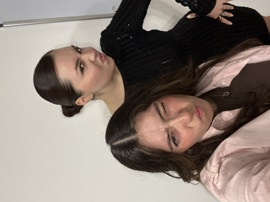 Two young women pose closely together, making exaggerated puckered faces towards the camera