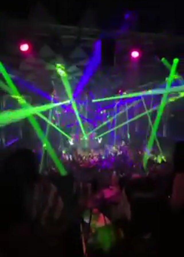 crowded nightclub, illuminated by bright green and purple laser lights. People are dancing and moving to the music. The camera pans around the room, showing the DJ booth and the sound system. The crowd is a mix of people, mostly in dark clothing, moving and grooving to the music. The overall atmosphere is lively and energetic.