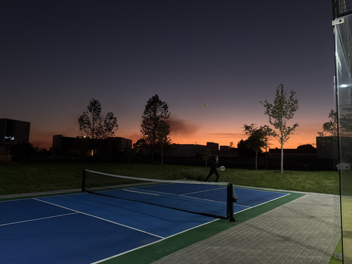 A person plays padel on a blue court with a net under a colorful sunset sky. Tall trees and buildings are silhouetted in the background. The court is surrounded by green grass and a tiled pathway. A glass wall is visible on the right side of the court. The sky displays hues of orange and dark blue.