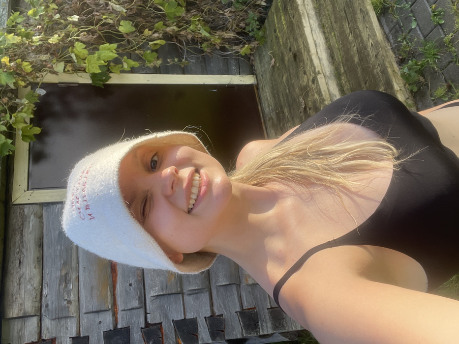 An outdoor, eye-level selfie depicts a fair-skinned female adult with blonde hair, styled in a ponytail, winking and smiling at the camera. She wears a black spaghetti-strap top and a white felt sauna hat with red Cyrillic text ("CЧАСТЬЯ И ЗДОРОВЬЯ" - "Happiness and Health") embroidered on the front. Her face is illuminated by direct sunlight, casting shadows. In the background, a rustic, weathered wooden building, consistent with log cabin construction, is visible. A dark brown door with light trim is on the right, flanked by green leafy vines growing on the wall. Two wooden steps lead to the door. The ground beneath the steps consists of mixed pavement and sparse grass. The scene is located in the city of Kozhino, Russia, during daylight hours.