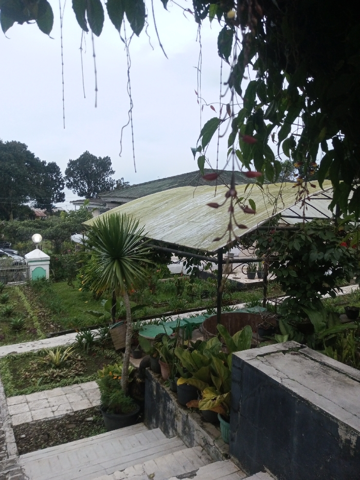 An elevated outdoor scene in Unknown, Vietnam, depicts a lush garden area under an overcast sky. In the immediate foreground, light-colored stone steps descend towards a garden. To the right, a dark grey concrete retaining wall or planter holds multiple potted plants, including large-leafed varieties. The midground features a pathway of light-colored pavers cutting through manicured green lawns and garden beds containing various shrubs and smaller plants. A prominent, tall, slender palm-like plant with spiky green leaves stands in this area. A large, light green or yellowish corrugated metal roof, supported by dark metal posts, covers an outdoor space in the center. Beneath this structure, more potted plants and dark, barrel-like containers are visible. To the left, a white pillar topped with a spherical light fixture stands near a green-arched gate. Beyond this gate, a paved area with at least two parked vehicles can be seen. In the background, numerous dense green trees and the roofs of distant buildings, one with a dark green tiled roof, are visible against a bright, overcast sky. The top of the frame is partially obscured by dark green leaves and long, thin, drooping vines, some bearing small reddish buds or flowers. No individuals are present.