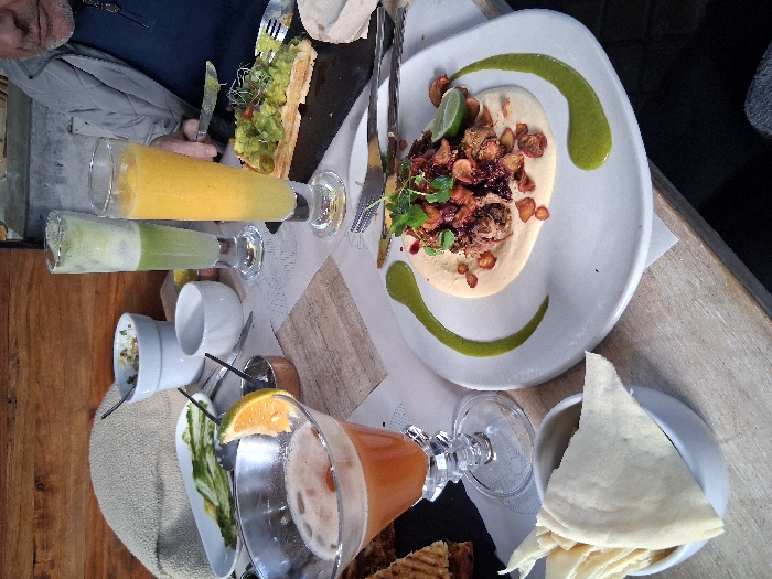 The image displays a table with a variety of dishes and drinks. There is avocado toast, a plate with hummus and meat, what appears to be tortillas, and multiple beverages. The drinks include two tall glasses with yellow and green liquids, and a larger glass with an orange slice. Flatware is visible on the table around the plates, and the table itself is made of wood.