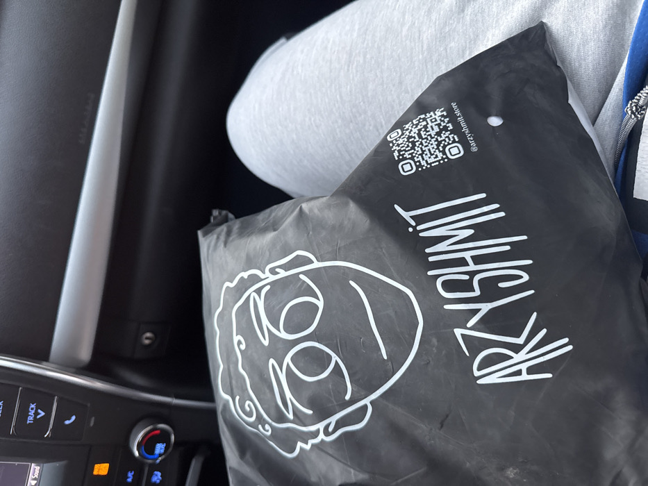 A black plastic bag, approximately 30-40 cm in width and height, featuring a white outline drawing of a cartoon face, the word "ARZYSHMIT," a QR code, and the text "@arzyshmit.store," rests on the lap of an individual wearing light grey sweatpants. The background shows the interior of a vehicle, specifically the passenger side dashboard and center console. Visible elements include black plastic trim, a horizontal silver accent strip, control buttons labeled "SEEK," "TRACK," and a phone icon, a climate control dial with red indication, and the word "AIRBAG" embossed on the passenger panel. The scene is located in Yerevan, Armenia.