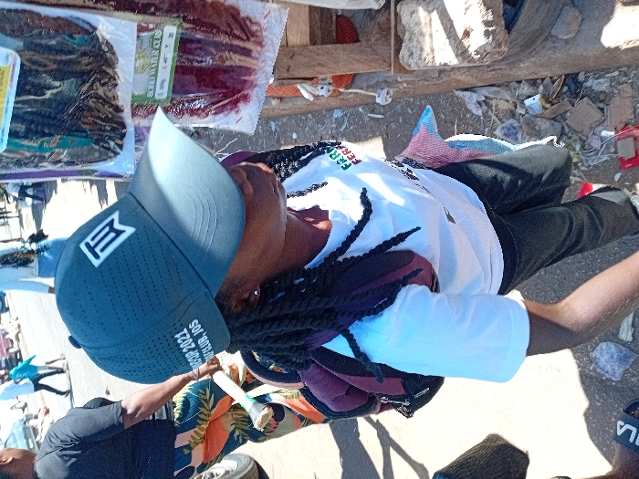 The image depicts an outdoor street scene in a bustling commercial area of Jos, Nigeria, identifiable by text on the primary subject's cap. The scene is illuminated by bright daylight, casting distinct shadows. In the foreground, a individual, likely young, with dark skin and braided hair, is oriented downwards and to their right, seemingly inspecting items displayed at a rudimentary stall. They wear a dark grey baseball cap featuring a white "TW" logo on the front and white text on the side that reads "TIGERCUP 2021 TIGER CLUB, JOS". Their attire includes a white short-sleeved t-shirt with partially visible green and red text ("FARM FRESH") on the left chest, dark trousers, and a purple backpack with black straps. A colorful, patterned cloth (blue, pink, white) hangs from their right side. To the immediate right of the central subject, a makeshift vendor's stall constructed from rough wooden planks displays various items in clear plastic packaging. One package prominently shows "BLOOD WAFER CLIPS" containing red, flat, translucent items. Another package above it holds dark, stringy items, likely dried food products. The ground around the stall and the central subject's feet is unpaved and appears dusty, scattered with small debris, rocks, and refuse. In the mid-ground, to the left of the central subject, a person wearing a black shirt and distinctive orange, green, and black patterned trousers is partially visible, holding a light-colored, long, cylindrical object, possibly a broom handle. Further in the background, several blurred individuals walk on a paved road or sidewalk, with a person in a light blue shirt being most distinguishable. Multiple vehicles are also visible on the road in the far background, indicating active street traffic.