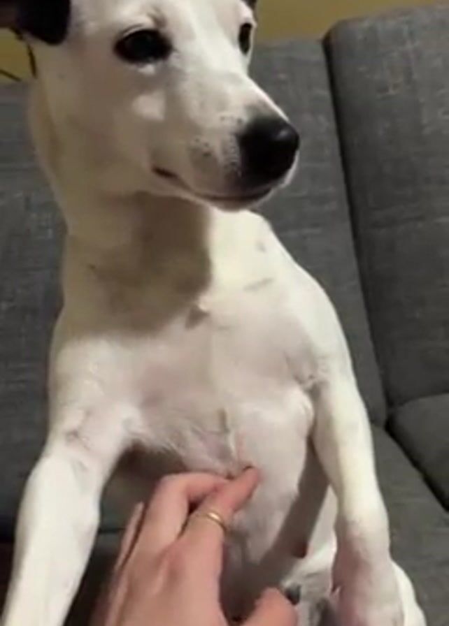 A close-up shot shows a white and brown dog sitting on a gray couch. A human hand with a gold ring strokes the dog's chest. The dog looks off to the side. The background is out of focus, but shows a wall. The overall lighting is bright.