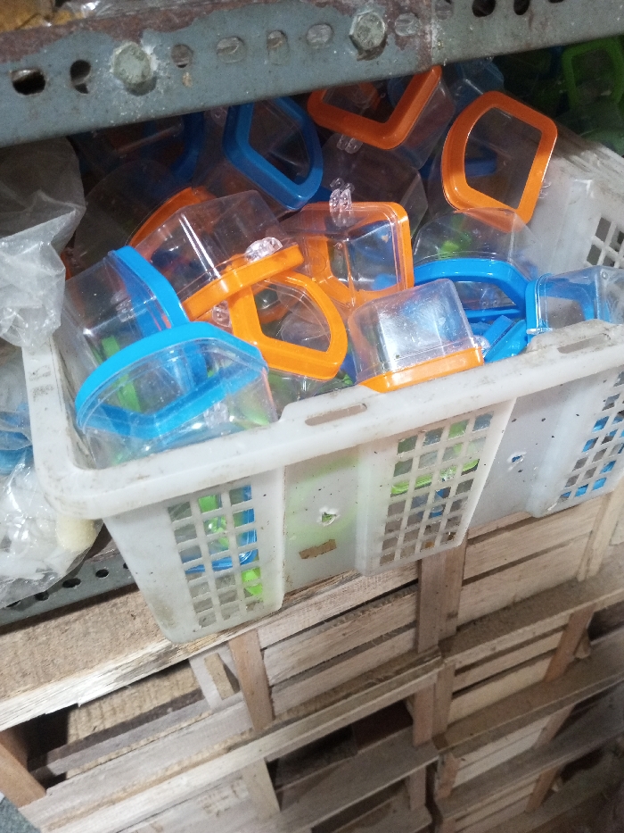 A white plastic basket, filled with small, clear containers with blue and orange handles, sits atop a stacked wooden crate. The containers appear to be toys or storage items. The basket has a grid pattern on its sides, and the wooden crate consists of multiple layers of planks arranged in a crisscross pattern. A rusty metal shelf looms above the basket. Some containers are partially covered by clear plastic bags.