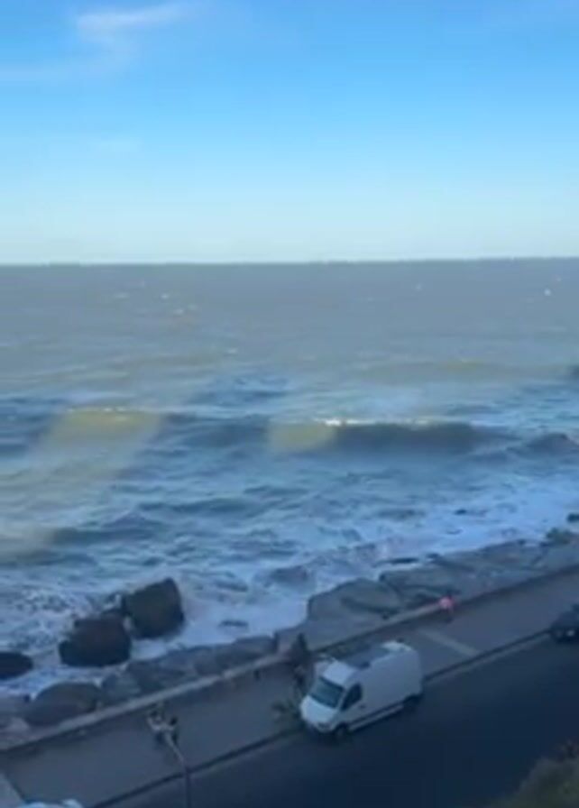 coastal view under a clear, blue sky with sparse clouds. The ocean is active with waves crashing against a rocky coastline. A road runs parallel to the coast, featuring a sidewalk with a few people walking on it. Several vehicles are parked along the road, including a white van and at least two cars. The camera angle is elevated, providing a wide view of the seascape and the adjacent street.