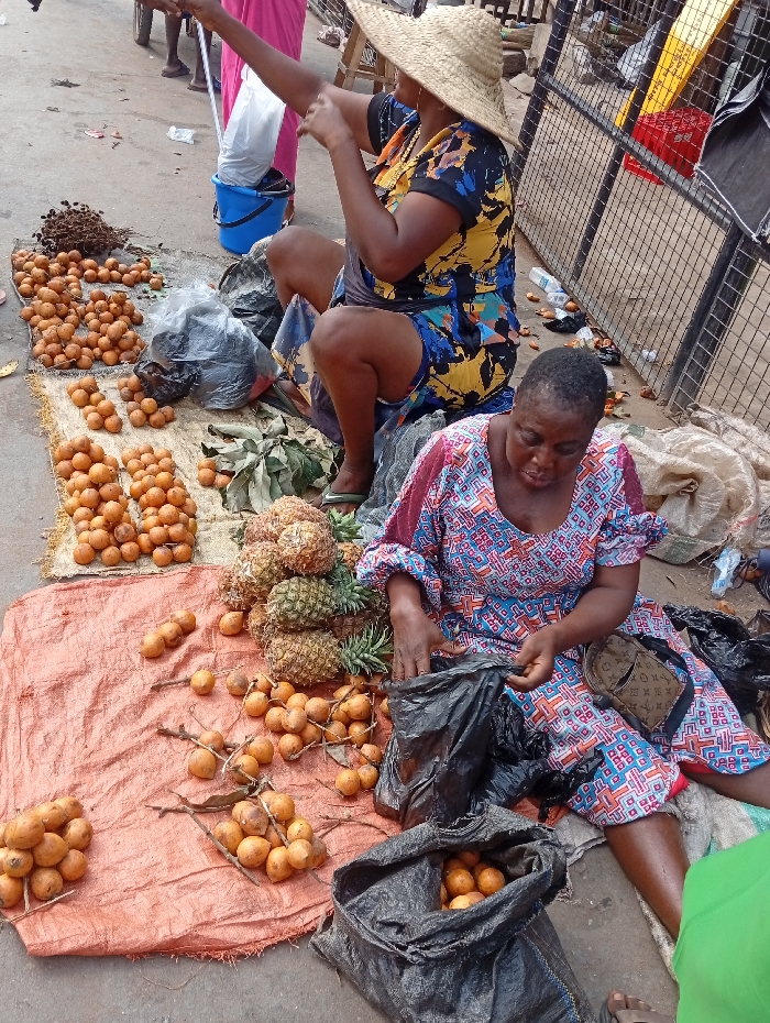 Two women are seated on the ground next to piles of fruit, likely at a market. One woman wears a straw hat and a blue and yellow dress while gesturing to a customer. The other woman wears a patterned dress and appears to be packaging fruit into a black plastic bag. The fruit includes pineapples and small, round orange fruits. The scene is outdoors, possibly on a sidewalk, with metal fencing visible in the background.