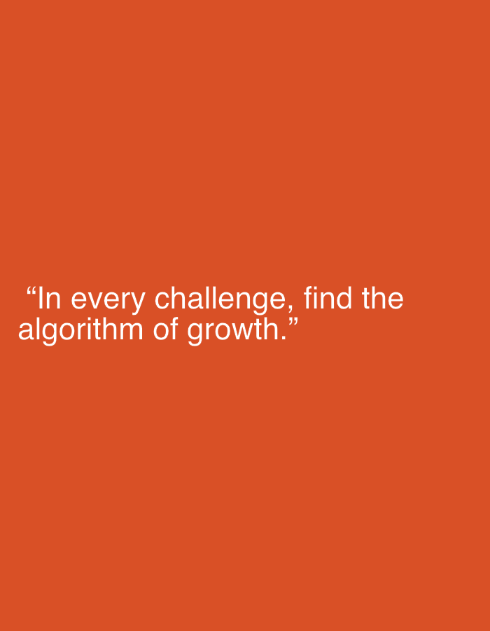 An image with an orange background presents the quote: “In every challenge, find the algorithm of growth