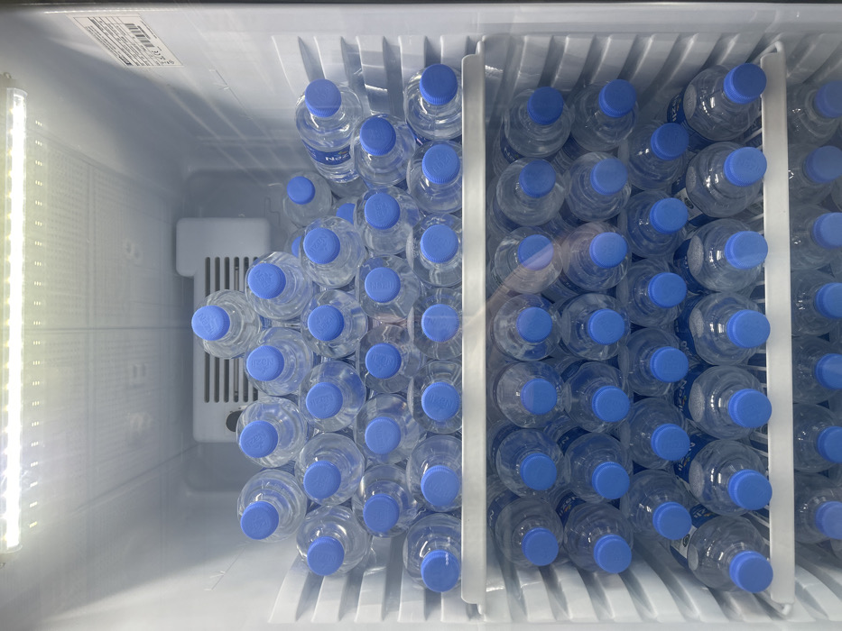 The image displays the brightly lit interior of a refrigerator filled with numerous clear plastic water bottles, each sealed with a blue screw cap