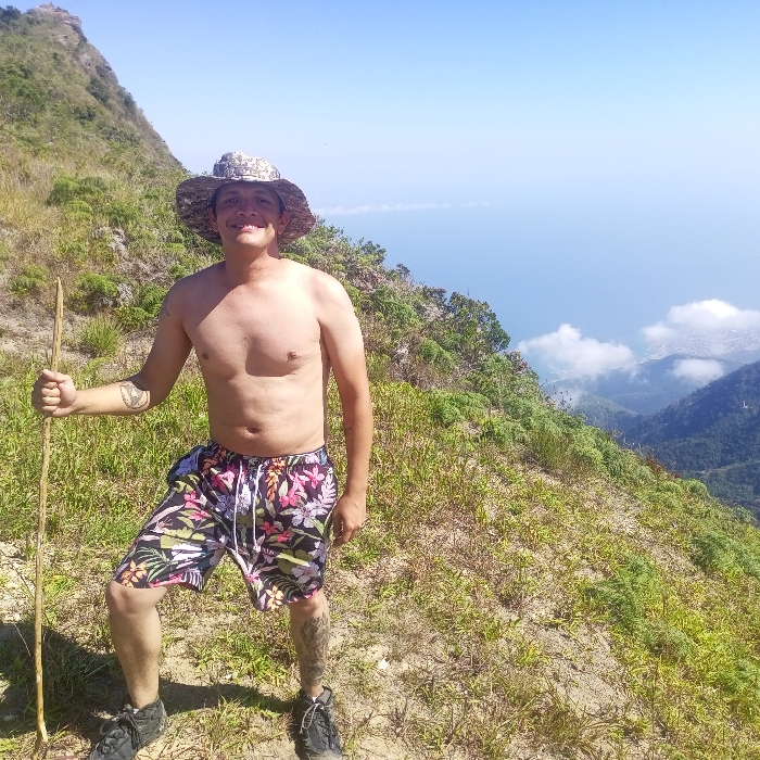 An adult male is positioned centrally, standing on a sparsely vegetated dirt and grass hillside in San José de Galipán, Venezuela. The subject, appearing to be in his 20s or 30s, is shirtless, wearing multi-colored floral patterned board shorts, a camouflage-patterned bucket hat, and dark-colored athletic or hiking shoes. He holds a slender, natural wooden stick vertically in his left hand, with the lower end resting on the ground. A dark tattoo is visible on his left forearm. The male is smiling directly towards the camera. To the subject's left, a steep, green mountain slope ascends. To the right and in the background, a clear blue sky extends over a vast expanse of calm ocean. Below the ocean horizon, partial white cloud formations partially obscure a view of a populated coastal area or city nestled in a valley. The scene is illuminated by bright daylight, indicating clear weather conditions at a high altitude overlooking the coast.