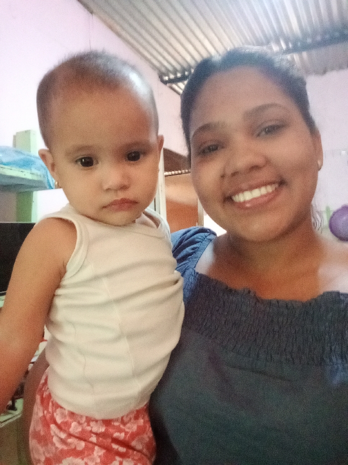 A close-up, vertical image depicts an adult female holding an infant/toddler indoors. The adult female, appearing to be of Latin American ethnicity, is positioned on the right, smiling broadly towards the camera with visible white teeth. She has dark hair pulled back and wears a dark blue, off-the-shoulder top with smocked detailing at the neckline. The infant, also appearing to be of Latin American ethnicity, is held in front of the adult, to the viewer's left. The child has light brown skin, short dark hair, and a neutral, slightly solemn expression, looking towards the camera. The child wears a white sleeveless undershirt and red shorts with a white floral pattern. Small hoop earrings are visible in the child's ears. The background is partially out of focus, revealing a light-colored wall and a corrugated metal ceiling. In the upper left background, a light blue fabric item is visible, possibly draped over an object. A blurry purple object is visible in the upper right background, behind the adult's shoulder. The location of Santo Domingo, Venezuela, cannot be determined from the visual information presented in the image.
